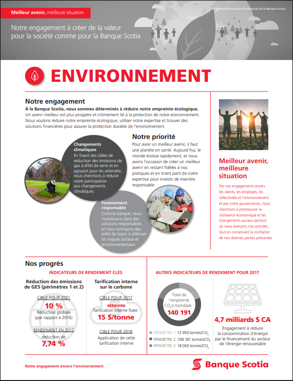 Nous cherchons à créer un avenir meilleur en réduisant notre empreinte écologique, en investissant dans des solutions responsables et en octroyant des prêts de façon à atténuer les risques sociaux et environnementaux.
