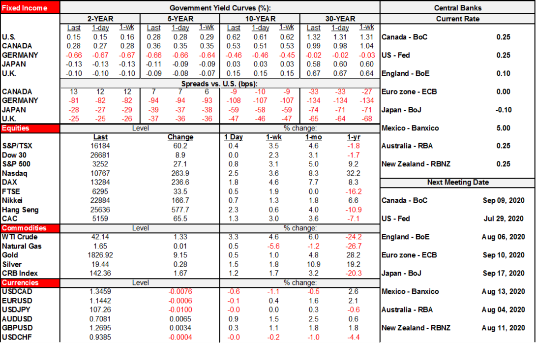 The EU passed its stimulus act and at least they’re talking about doing so in the US before the August recess although President Trump appears unfocused in his stimulus targets which may limit success. Both considerations are at least partly behind another risk-on move across global markets. The A$ is outperforming on fiscal extensions and RBA jawboning. Canada updates a couple of months of retail sales figures that should provide a tentatively complete Q2 picture of a substantial rebound. The US calendar should be quiet.