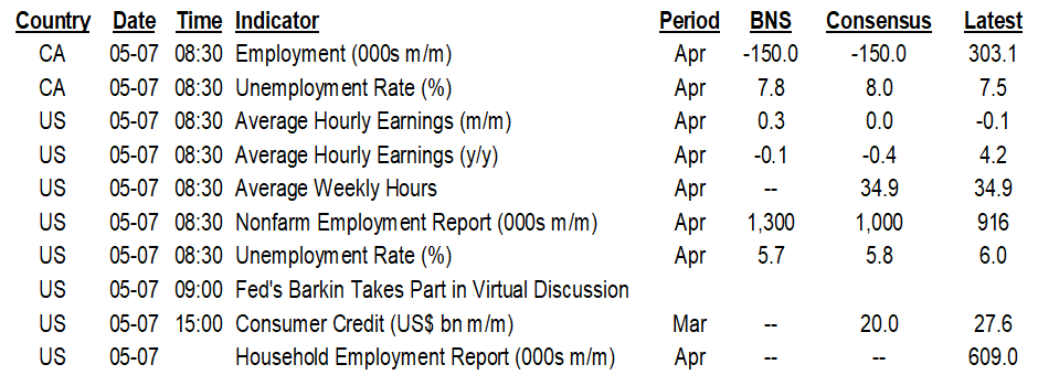 There is mild risk-on sentiment so far. US payrolls are all that matter to global markets and Canada’s jobs report will be followed in the local market. Chart 1 shows the movements in COVID-19 restrictions in the two countries that is basically the rationale behind why an acceleration of US job growth and a loss of Canadian jobs is likely to occur. Other overnight releases were relatively trivial and mostly a round-up of European industrial and export figures that are irrelevant on a day with payrolls. The one exception was a remark by an ECB Governing Council Member (Kazaks) that they could reduce the pace of PEPP EGB buying at the June meeting. Lagarde is speaking now but so far is not broaching the topic.
