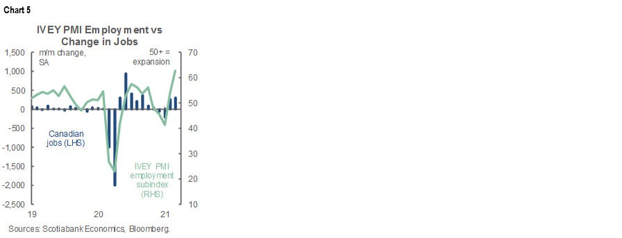The main reason jobs rebounded the prior month was because restrictions eased right before the reference week that includes the 15th of each month. There was also a seasonal distortion to education employment because of the delayed Spring break. Almost right after that easing the third wave got out of hand and governments tightened up to the same level of restrictions as previously. Because the Spring break aligned with the reference week, we could see a notable drop in education sector employment. Unlike the US, the suite of advance indicators is rather poor in Canada. ADP is useless. StatsCan’s payrolls report is too lagged to matter. Ivey’s employment subindex for April unfortunately arrives after the jobs report this morning but it had previously soared (chart 5)