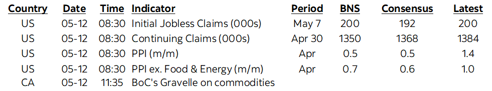 US producer price inflation for April is expected to be cooler than March but remain elevated. Prices are estimated to have risen by about ½% m/m with prices ex-food and energy perhaps a touch firmer than that. US weekly initial jobless claims are due at the same time (8:30amET).
