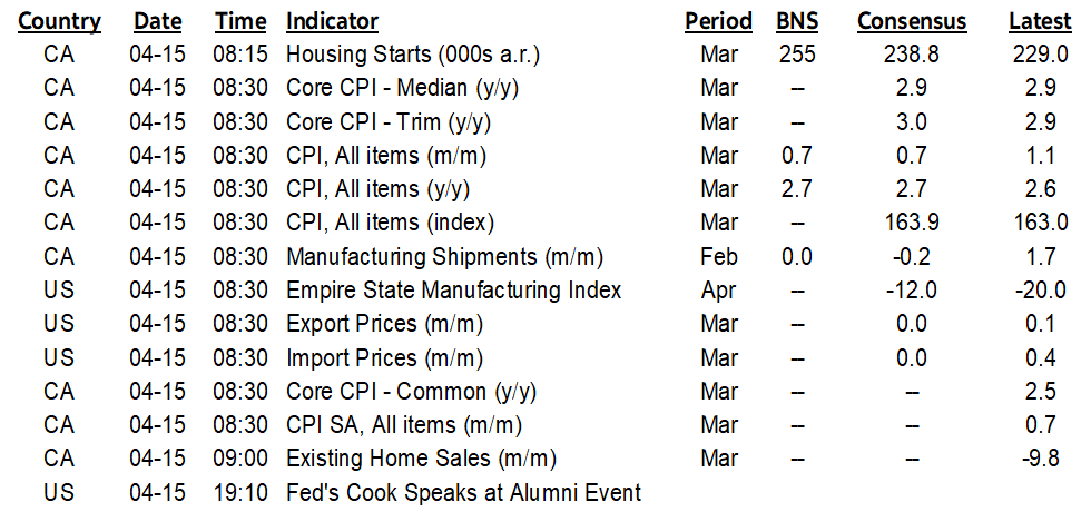 Other minor data will include US import prices in March (8:30amET, future releases will matter more), revised Canadian manufacturing shipments for February (8:30amET), the US Empire gauge (8:30amET) that kicks off the regional surveys on the path to the next ISM-manufacturing report, and a pair of Canadian housing releases (existing home sales at 9amET and starts at 8:15amET).