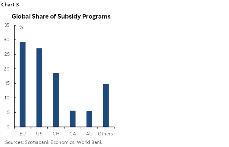 What’s missing from Navarro’s claims is any reference to subsidies. That’s likely intentional because here’s where the US halo becomes rather tilted. The World Bank, IMF , OECD and WTO collaborate on tracking subsidy programs around the world (here, here and here). Chart 3 summarizes the outcome. The US accounts for 27% of all global subsidy programs, more than China at 18.5%, and similar to the EU. Countries like Canada get dragged along the subsidy path because of the dominance of such programs elsewhere.