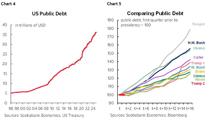 Navarro says that the theory that trade imbalances should always be eliminated through price and exchange rate moves is fundamentally wrong because of foreign protectionist barriers against the US that prevent rebalancing. The error Navarro is making is holding all other US policies constant throughout the period of persistent US trade and current account deficits. That’s unfair because the US keeps encouraging irresponsible fiscal policy and excess consumption while not saving enough as a country and therefore it pulls in excess imports while driving a strong dollar that harms exports. US policy serves as offsets to equilibrating market mechanisms. Expensive military incursions abroad including the WMD hoax and constantly giving away unfunded tax cuts explain much of the rise of US public debt (chart 4) and four of the biggest run-ups in US public debt have come under Republican Presidents including Trump 1.0 (chart 5). Trump 2.0 is only just beginning.