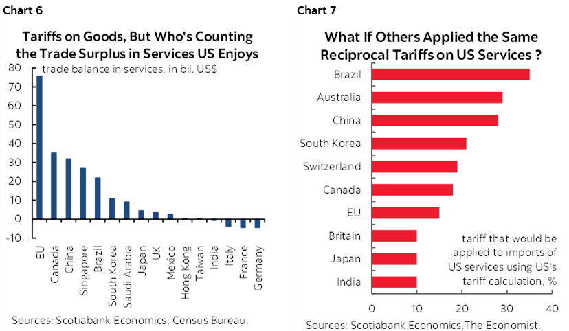 Navarro ignores that the US is better at services than most, hence its persistent services trade surplus, and including some of the best enterprises in fields like tech and finance. Mr. Navarro doesn’t address why market mechanisms like prices and exchange rate movements have been unable to close the US services surplus over time like he alleges toward the goods deficit. It’s probably because the US is better at many of these services but I guess when it’s a surplus he ignores it! Chart 6 shows a break down of the US services surplus by country and how vulnerable the US balance with Europe may become if Europe retaliates. Chart 7 is replicated from The Economist and shows what would happen if other countries applied the same formula the US did against US services exports. China and the EU, UK, Canada and Japan could utterly crush US services exports but to the detriment of all.