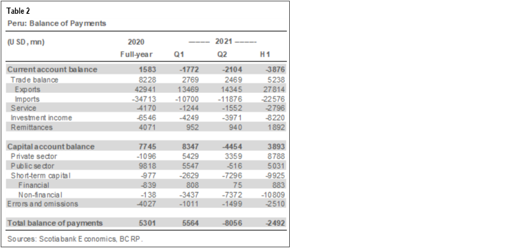 PERU: Q2 RESULTS POINT TO STRONG PRIVATE INVESTMENT AT THE SAME TIME AS SHORT-TERM CAPITAL OUTFLOWS; CONGRESS AWAITS THE NEW CABINET