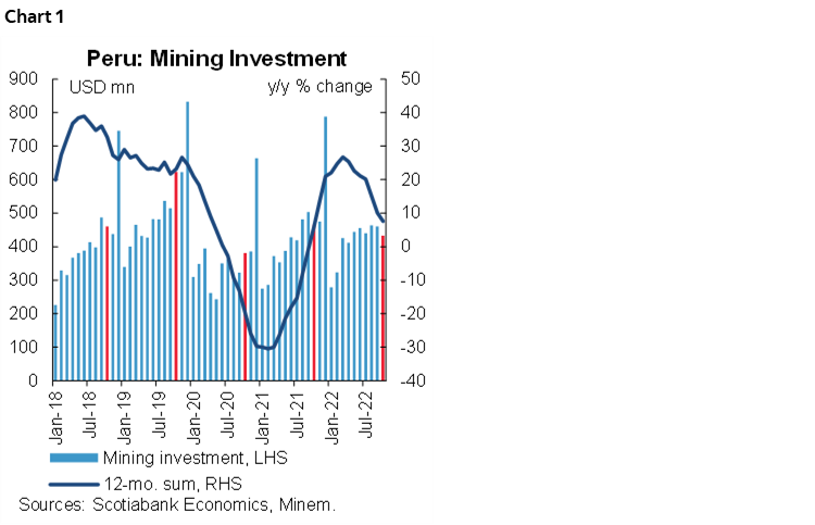 Peru’s mining investment fell 7.1% y/y in October, according to data from the Ministry of Mining (chart 1). In the January–October period, mining investment increased 3.8% y/y. These monthly declines during the second part of the year (H2-2022) align with our expectations of a 4.2% overall drop for 2022. We expect mining investment to fall 11.3% in 2023.