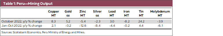 Mining output was mixed across the different products (table 1). Copper output increased 8.3% y/y in October, principally due to the start of Quellaveco operations in September. The mining company started with an output level of around 20,000 FMT (fine metric tonnes) per month. If it maintains the same levels for the remainder of 2022, it will exceed what was projected by the mining company for this year (75,000 FMT). Next year, it should produce at full capacity (300,000 FMT per year).