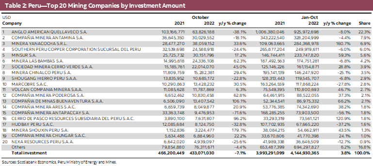 Anglo-American’s Quellaveco project continues to decrease its investment. In October, investment fell 38.1% m/m (table 2) and we expect it to continue decelerating until the end of the year. Meanwhile, Antamina investment continues with plans to expand operations over the next eight years, as does Minera Yanacocha’s sulphide project.