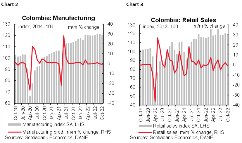 On Thursday, the National Statistics Institute (DANE) released its monthly surveys of economic activity for October. Manufacturing production and sales showed a less strong performance than expected. Meanwhile, services-related sectors remained strong (charts 2 and 3).