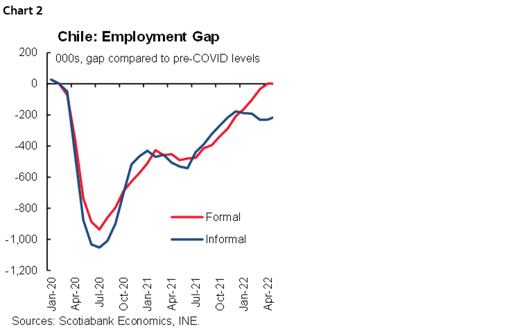 With the latest readings, the employment gap with respect to the pre-pandemic level remains closed at the formal level and was reduced to 209k jobs that still need to be recovered at the informal level (chart 2). By economic sectors, accommodation and recreation and culture show the greatest lag, while construction, commerce and manufacturing activity have already closed the gap. Meanwhile, salaried job creation has stalled, despite the Labour Family Income (IFE) given by the government. In May, the destruction of total salaried employment stood out, after several months of good performance that was supported by the existence of the IFE. For now, self-employment is offsetting the loss of salaried employment (public and private). However, its buffering role is not guaranteed hoping forward, and labour market performance will largely depend on the ability of services to sustain employment, mainly those that are still somewhat lagging, such as sectors related to tourism (accommodation, leisure and culture) or professional services.