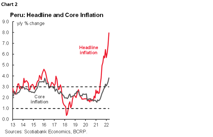 In our Latam Weekly of April 29, 2022, we revised our inflation forecast for 2023 from 3.0% to 4.0%, with the message that we see inflation as more persistent and therefore less likely to return to the target range next year. The central bank estimates that inflation will return to the target range by the second half of 2023, but its chairman, Julio Velarde, recently warned that there is a risk that inflation will persist in the longest period outside the target range. From 2000 until now, the longest period with inflation above 3% was 21 months (between October 2007 and June 2009). With April’s result, there have now been 11 consecutive months in which inflation exceeded 3%.