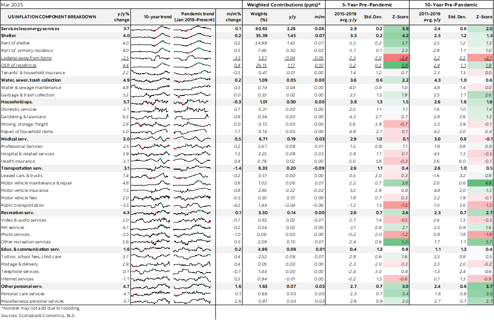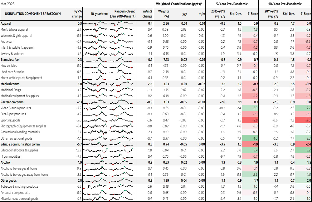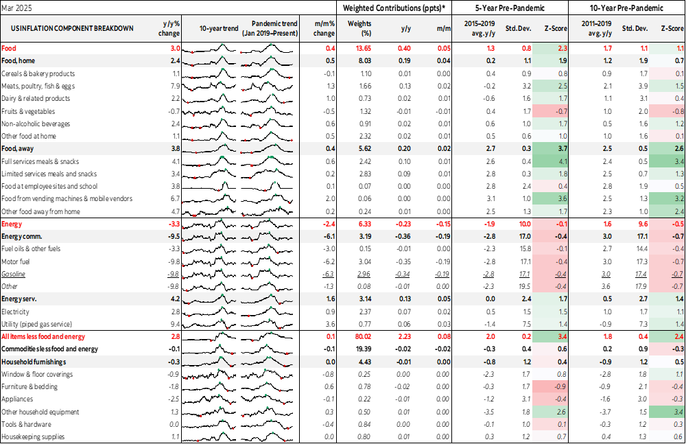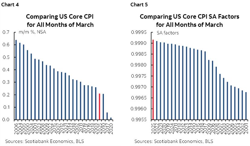 Chart 4 shows this was an abnormally weak core CPI print compared to other seasonally unadjusted March readings in history and chart 5 shows that it would have been weaker yet if not for one of the strongest SA factors on record. Please see charts 6–25 for components and the summary table that includes further detail and charts.