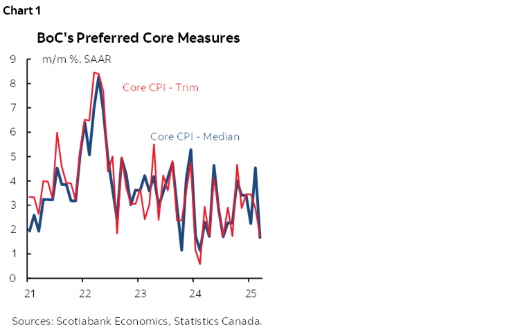 Key is that the BoC’s two preferred measures of core inflation slowed to 1.7% m/m at a seasonally adjusted and annualized pace (SAAR). Chart 1. Traditional core CPI (ie: ex-food and energy) fell by -0.8% m/m SAAR.