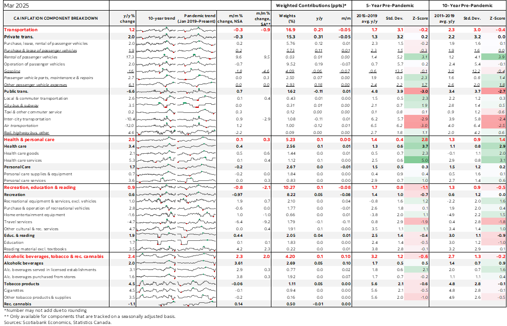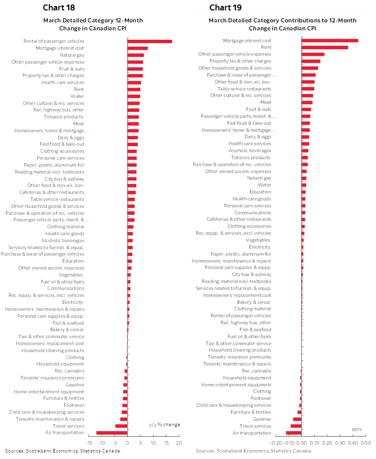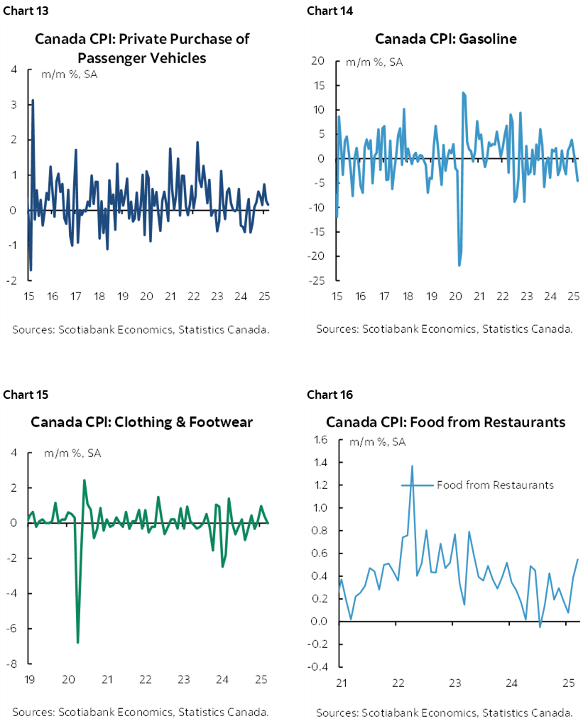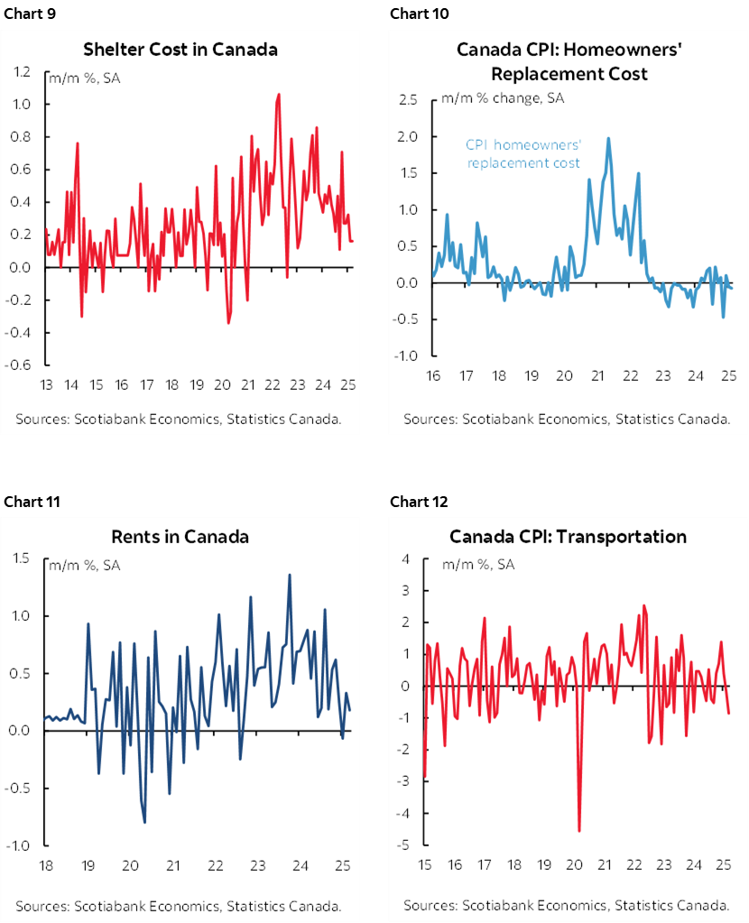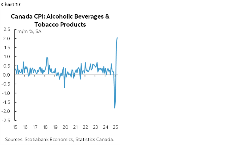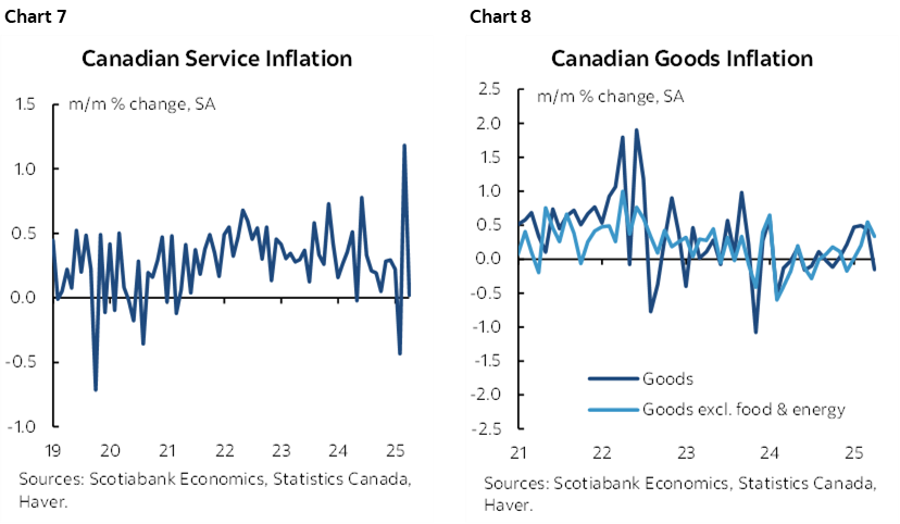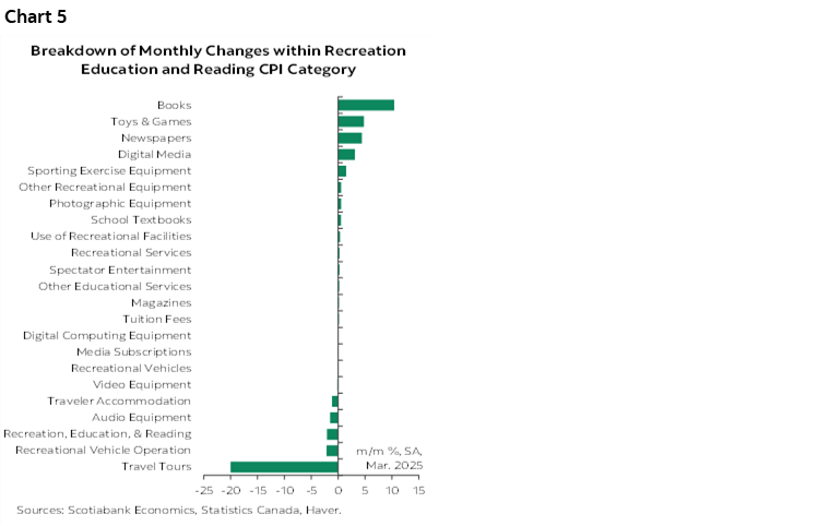 Another big reason for fading this is that the first round effects of trade wars was disinflationary as Canadians aborted travel plans particularly to the US. That’s why the 10% weight on the recreation, reading and education category and its –2.1% m/m SA drop shaved about 0.2ppts off of total SA CPI. Chart 5 shows why; travel tour prices plunged by about 20% as Canadians boycotted travel due to a weak currency and as a protest against the Trump administration’s slanderous treatment of Canada.