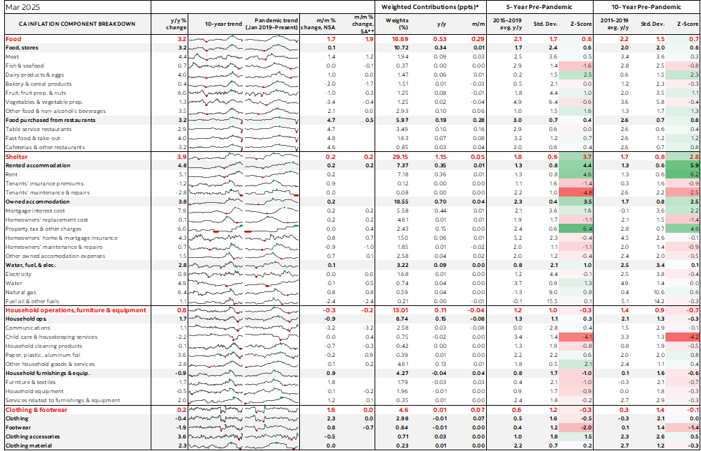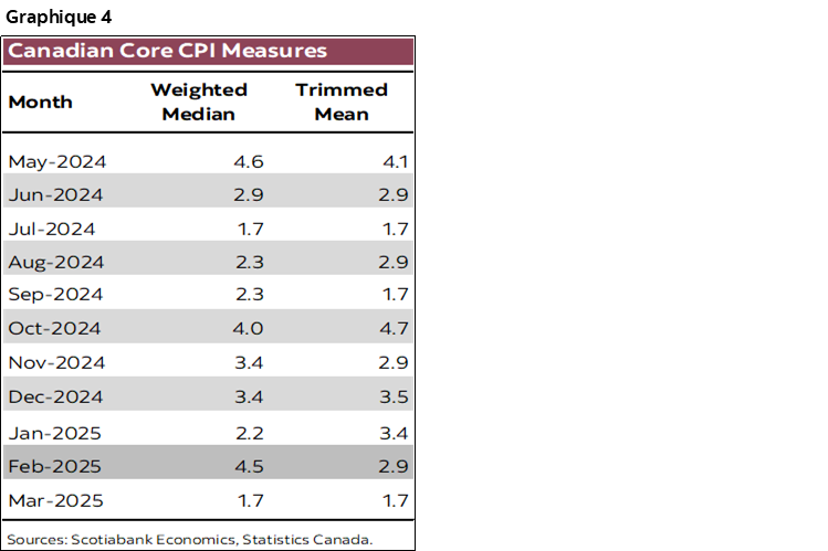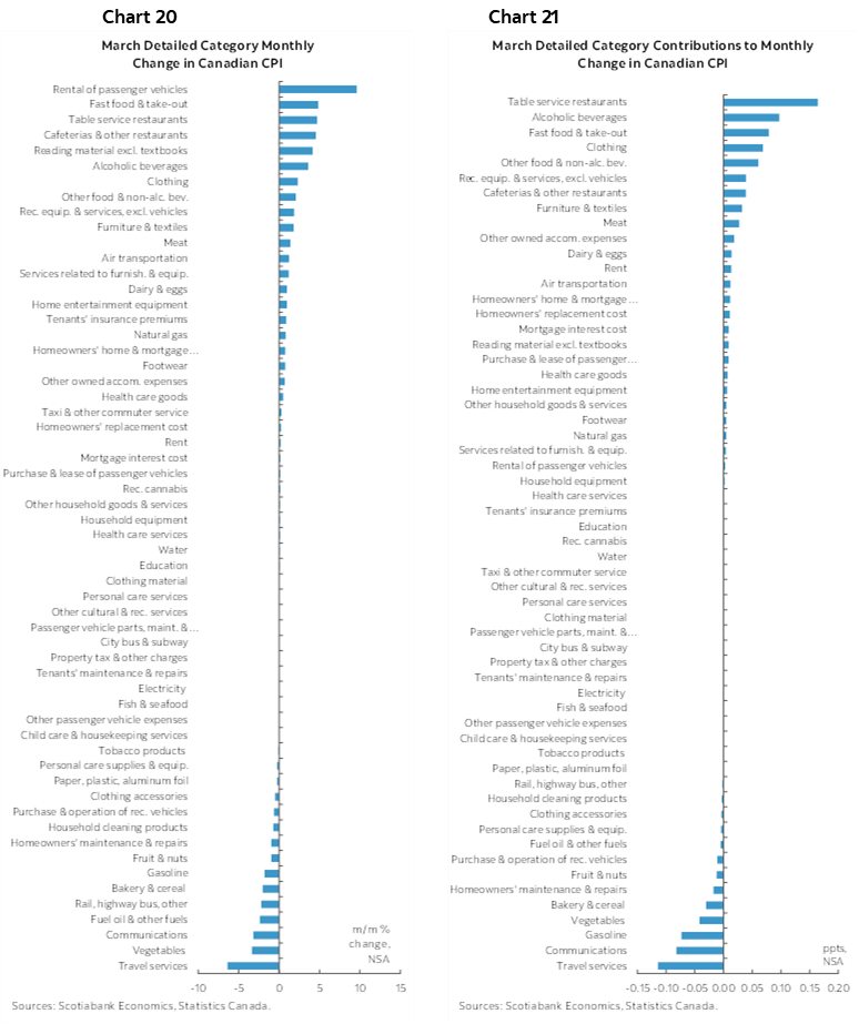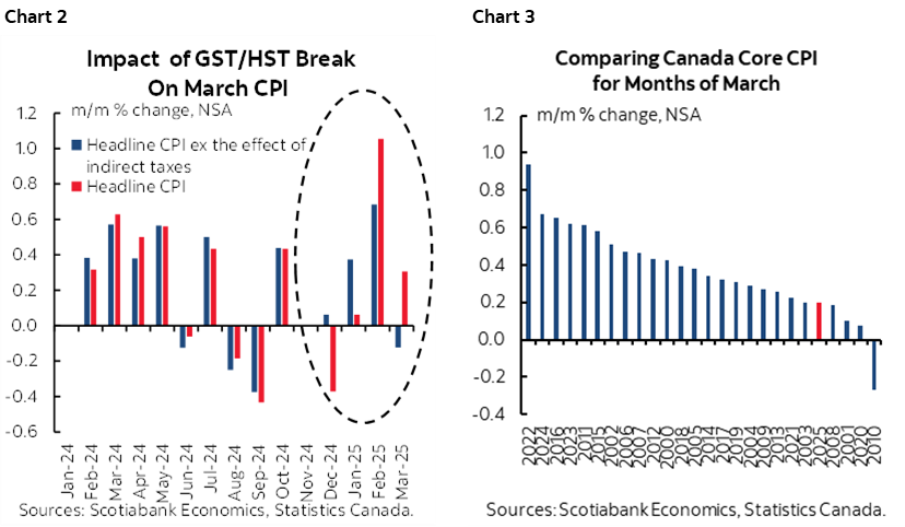 That’s the main reason why headline fell shy of everyone’s expectations at 0.3% m/m NSA. The effects of the end of the GST/HST cut worked as expected by lifting CPI by 0.4% m/m NSA as shown by the spread between CPI and CPI excluding the effects of changes in indirect taxes (chart 2). But this was an unusually light month of March for seasonally unadjusted CPI (chart 3).