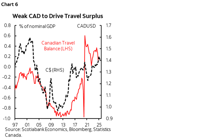 Expect more of this going forward. Chart 6 shows the tight correlation between the two-way travel spending balance and USDCAD movements over time. Canada was running a travel spending deficit of about 1% of nominal GDP about a decade ago (ie: spending more abroad than foreigners were spending in Canada) but this has since swung to a surplus of about 0.2% at the end of 2024 and with probably a bigger surplus when we get Q1 numbers.