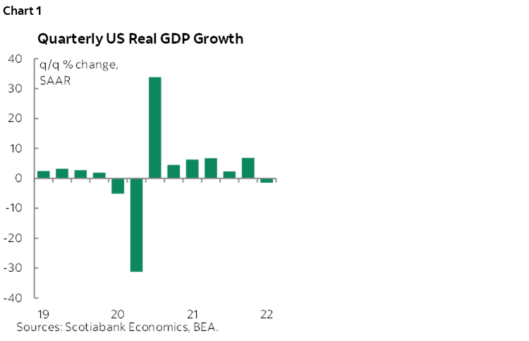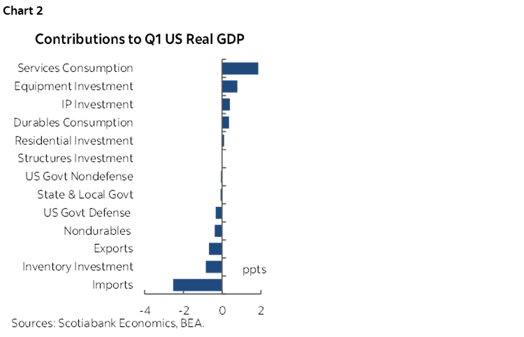 US GDP landed materially weaker than most economists expected including us, unless you’d perhaps be so generous as to give us points for getting the number right despite the sign! That doesn’t mean the 1.4% annualized contraction should be ringing recession bells despite the first dip since the pandemic started (chart 1). Here’s why and details are here.