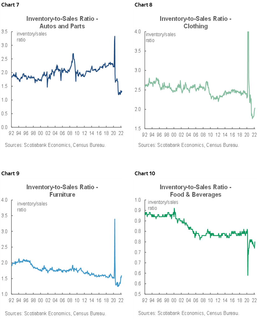 Charts 7–13 break down retail inventory-to-sales ratios by most retail sectors. The lean conditions are not just in autos. Apparently clothing, eating and drinking all remain optional. Other categories have restocked compared to a few months ago which may be part of why inventory investment eased overall, but there remains more work to be done.