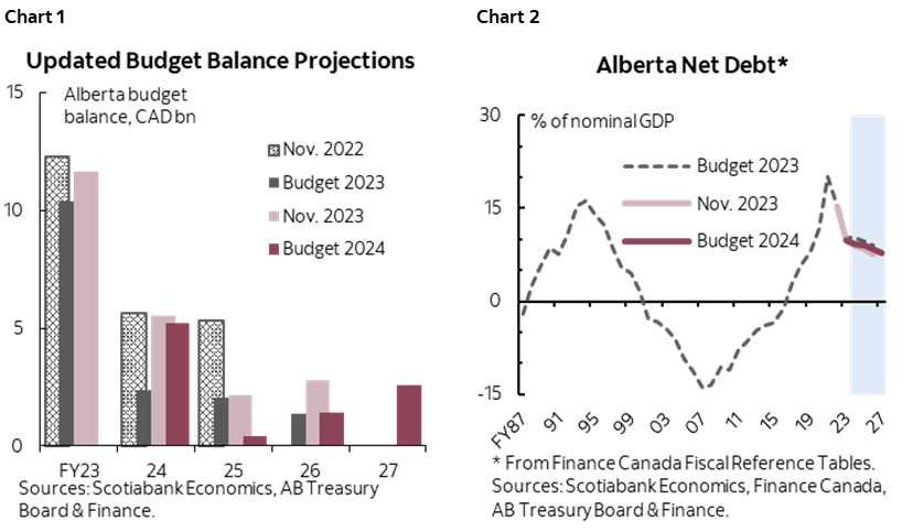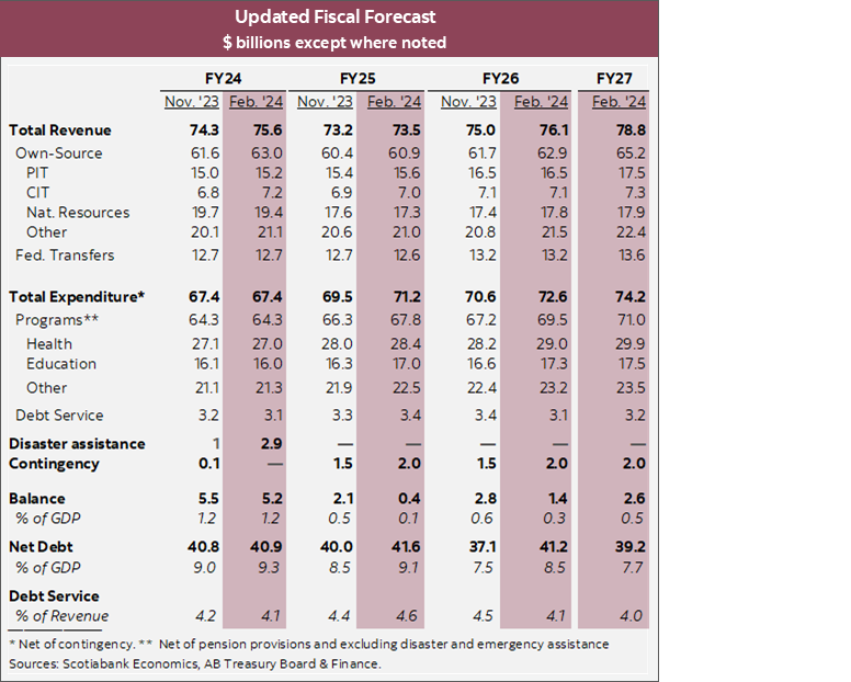 In light of a less favourable commodity outlook, Alberta’s once-massive budget surplus is feeling the pinch as heightened spending takes centre stage. The FY24 surplus is expected to come in slightly lower but still at a hefty $5.2 bn (1.2% of nominal GDP). The FY25–26 surplus projections are slimmer than anticipated in the mid-year update owing to new spending initiatives and enhanced contingencies. The province expects to comfortably remain in the black by keeping spending growth well below strong revenue gains over the medium-term with a surplus of $2.6 bn (0.5% of GDP) projected in FY27. The Budget includes a sizable contingency of $2 bn each year from FY25 to FY27.