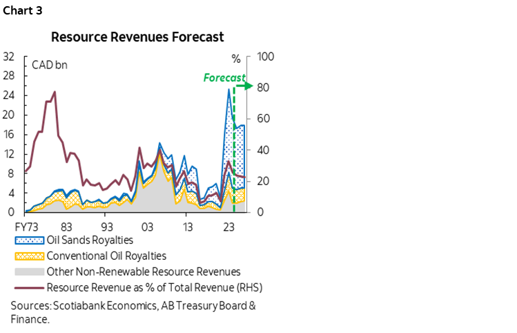 A series of upward revisions on the revenue side puts the province on a better trajectory, while anticipating stronger headwinds in the near term. The government forecast a $2.9 bn improvement in its FY24 bottom line relative to the last budget plan due to increases in personal and corporate income tax revenue, along with $1.8 bn more in bitumen royalties. Revenue is nevertheless projected to decline in FY25 by -2.8%, reflecting softer energy prices and a slower economy, mainly driven by the -10.8% contraction in natural resource revenue. Nevertheless, natural resource revenues, especially from oil sands royalties, remain pivotal to Alberta’s coffer, projected to contribute around 23% of the province’s revenue over the planning horizon (chart 3). With a narrower light-heavy differential expected, revenue from bitumen royalties is forecasted to grow over the next two years, contrary to declines anticipated previously. Over the medium term, the province remains optimistic and expects revenue to pick up rapidly by around 3.5% each year for the next two years.