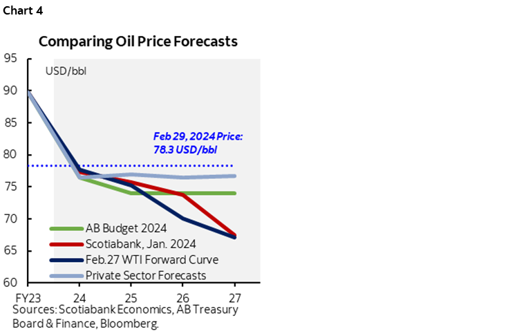 Economic assumptions underpinning the current plan, while prudently factoring in oil price risks, exceed private-sector growth averages, exposing the plan to potential downside risks. In the baseline scenario, WTI is assumed to average US$74/bbl each year over the planning horizon, well below the average of private-sector forecasts and the current market pricing for near-term prices (chart 4). Scotiabank GBM shares the cautious view on commodity prices, forecasting near-term pressure from macro headwinds to constrain WTI prices in 2024, with weaker medium-term forecasts reflecting softer demand. The government presented an alternative scenario where WTI prices dip below US$60/bbl in FY25 and remain subdued under US$67/bbl for the following two fiscal years. This alternative forecast suggests a potential shift back to deficits, with an estimated impact ranging from $7–8 bn annually on the province’s bottom line—an unlikely outcome in the prevailing demand-supply dynamic that keeps oil prices largely range-bound. The government foresees the province’s economy outpacing last year’s growth, fueled by increased business investments in both the energy and non-energy sectors. Projections indicate a real growth rate of 2.9% for the current year—1.6 ppts higher than the private-sector average—followed by an acceleration to 3.3% next year with sustained momentum thereafter.