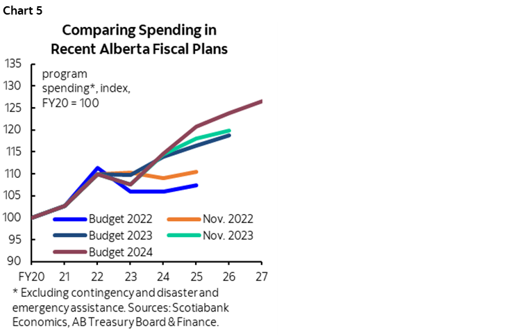 - Program spending lifted by around $2 bn each year through FY25–FY26 relative to the mid-year update, with grow rates still below the bounds of the speed of population growth plus inflation. New spending appears properly targeted and could prove beneficial to the province’s long-run growth.
