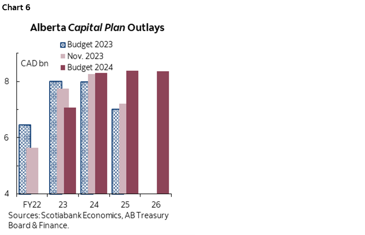Stepped-up Infrastructure spending should help support the province’s growth and diversification. Relative to the 2023 budget plan, capital expenditures have been increased by $2 bn (chart 6). Outlays under the Capital Plan were set to rise by 17% to $8.3 bn in FY25 and remain elevated through FY27. Projects targeted under the province’s Capital Plan include municipal infrastructure, healthcare system, education facilities, and various construction activities deemed likely to stimulate economic growth and local job creation.