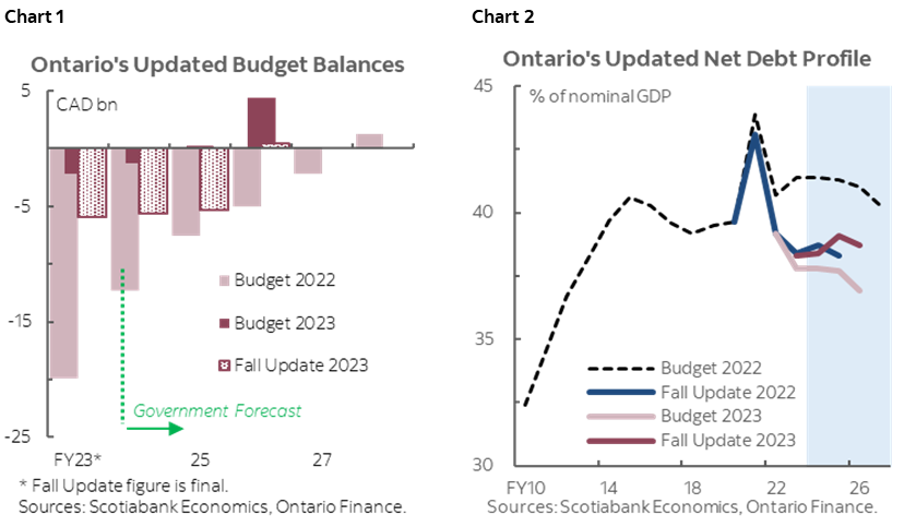 In light of a highly uncertain environment, the province continues to provide transparency by presenting alternative fiscal paths under higher- and lower-than-baseline growth scenarios. Under the slower growth scenario, which includes a -0.9% contraction in real growth in 2024, deficit could widen by $2.1 bn in FY24, $6.6 bn in FY25 and $8.8 bn in FY26. A more optimistic scenario could see a balanced book in FY25.
