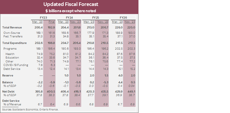 As widely anticipated, Ontario’s fall update projects a deterioration in the province’s bottom line, driven by weakness in own-source revenue. Following the downward revision to revenue reported in the FY23 Public Accounts, the province projects larger deficits across the three-year forecast horizon, with shortfalls increased by a total of $13.7 bn versus the 2023 Budget. The return to balance was delayed to FY26—one year later than previously anticipated. The current consolidation plan is still anchored by an optimistic medium-term outlook, which shows a projected increase in total revenue by +4.2% annually over the three-year planning horizon (unchanged from Budget 2023), whereas program expense is expected to grow by +2.8% per year over the same period, leading to a rapid reduction in the budget deficit and a balanced budget by FY26.