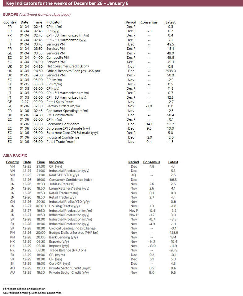 The period between Christmas and New Year’s Eve will be very quiet across global calendars with one exception being the ongoing focus upon developments in China. A key question is whether the rapidly spreading Covid virus in the wake of the massive relaxation of prior restrictions will damage supply chains and spark a renewed round of upside risk to global inflation.