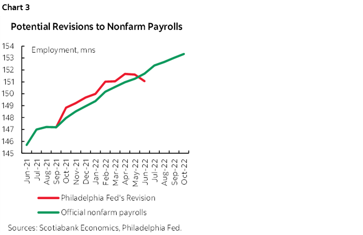 Second, we can’t just pick out one quarter. For the three quarters they do provide from 2021Q4 through 2022Q2, the Philly Fed approach says job growth was 733k higher than indicated by nonfarm payrolls in 2021Q4, 253k lower than payrolls in 2022Q1 and 1.1 million lower than payrolls in Q2 (chart 3). On net, the Philly approach says that payrolls may be overestimating job growth by about 70k/month over the full nine-month period they assess. That hardly seems like a hill to die on in the context of the +/-120k 90% confidence interval for any one month’s payroll estimates!