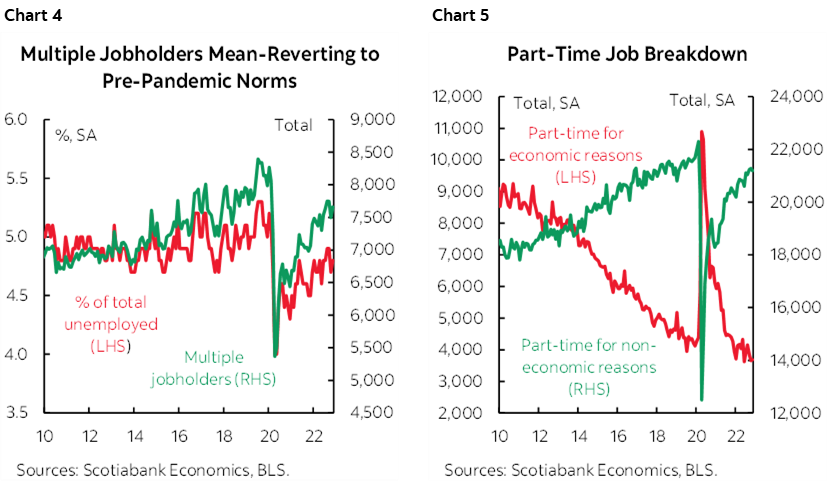 A key matter to the debate over potential revisions is what would cause such potential measurement discrepancies in the first place. On this there is a lot of uncertainty, but casual explanations are confronted by the data. Chart 4, for instance, rejects the notion that some advance that nonfarm payrolls overcount employment by counting positions versus the household survey that counts employed individuals. Multiple job holders have been little changed around 7½ million throughout this year with little change from month to month. This point is supported by part-time employment levels that have seen a rise in part-time workers for economic reasons offset by a decline in part-time workers for non-economics reasons (chart 5).