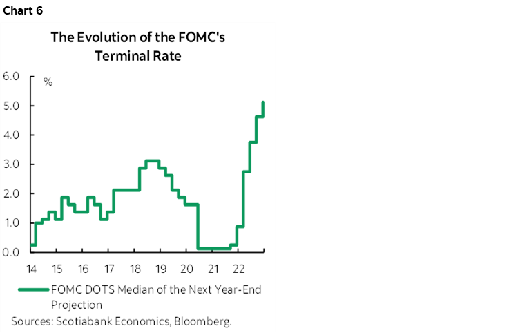 On this latter point, Chair Powell had said in his press conference that “I can’t tell you confidently that we won’t raise our terminal rate estimate again in March” and that “At each subsequent SEP this year we have raised this terminal rate.” True enough, as shown in chart 6.