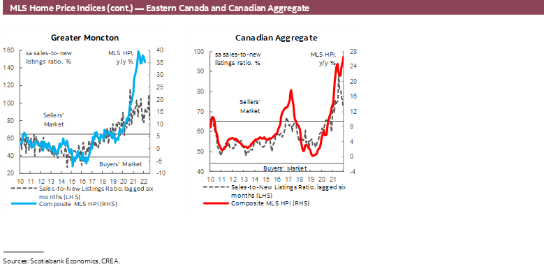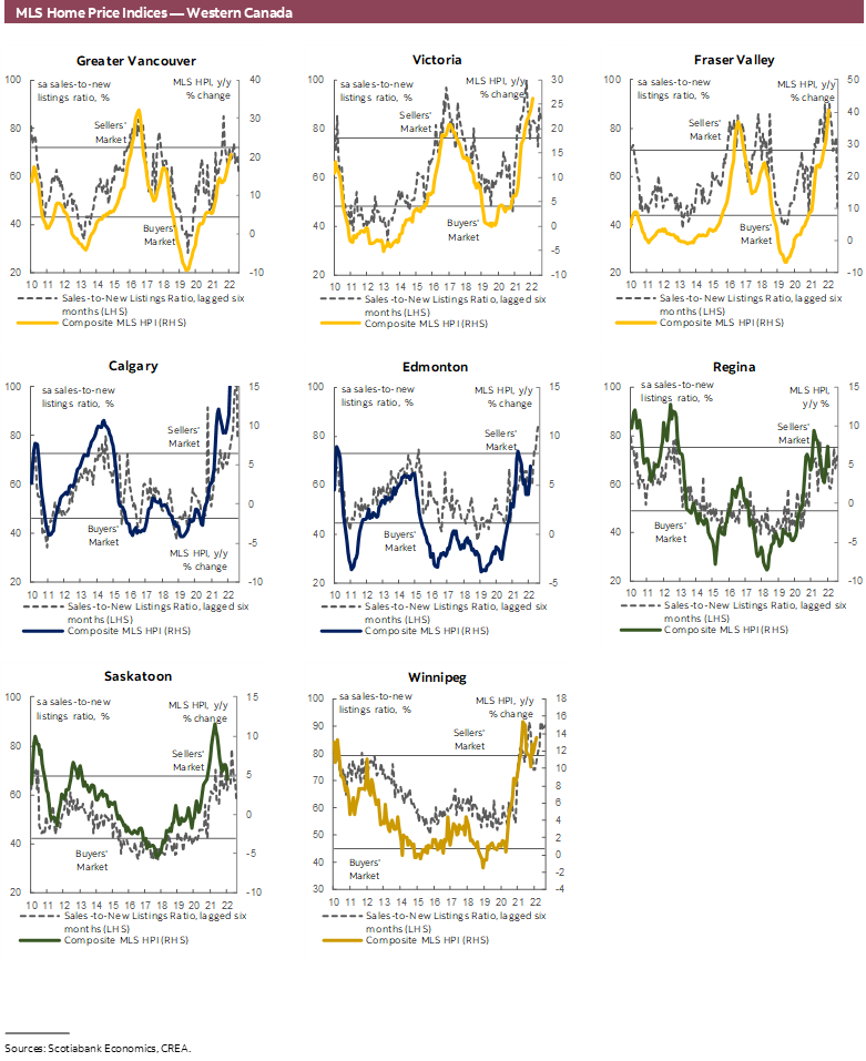 Canadian home sales rose by 4.6% (sa m/m) in February, dwarfed by a 23.7% (sa m/m) increase in listings. Due to this significantly larger gain in listings, the sales-to-new listings ratio, an indicator of how tight the market is, eased to 75.3% after spiking to 89% in January. Despite the improvement, the ratio remains notably higher than its long-term average of 55%. With listings still having a lot of catching up to do, historically tight market conditions brought about a 3.5% (sa m/m) increase in the composite MLS Home Price Index (HPI), breaking the record set in January for the largest ever monthly price gain. Townhomes were the primary driver of February’s record price increase.