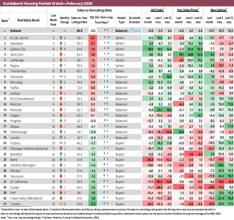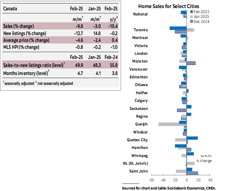 In February, sales declined in nearly 3/4 of the markets we track with most significant declines observed for Ontario and British Columbia centres. A similar story emerges for the progression of new listings from January to February 2025.
