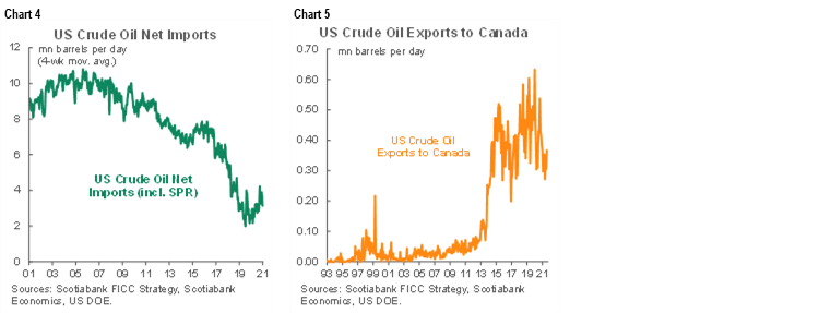 i) WTI Crude oil dummy variable (2000–2013 = 0, 2014–pres. = 1). We find that the sensitivity of the exchange rate to the price of oil declines starting around 2014, seemingly reacting with a lag to increased crude oil production in the US (mainly shale). While the US’s deficit with Canada in oil has continued to widen, the broad US crude deficit has narrowed significantly (chart 4, and chart 5 for US exports to Canada)—thus reducing the multilateral impact of higher crude prices on the USD. Going forward, we think that increased vehicle electrification and green energy efforts will likely see reduced reliance on oil and thus a reduction in the sensitivity of the USD to its price. Similarly, Canada’s energy sector has since become a smaller share of the country’s economy so fluctuations in oil prices have smaller reverberations on Canadian assets.