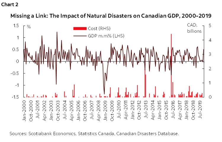 Yet despite these expenses, it can be hard to spot lasting impacts from natural disasters within economic data (chart 2). This murkiness can be attributed to two factors: a lack of sufficiently frequent and granular data to precisely identify the impacts from a single localized disruption, and the reality that the periods of investment and construction following disasters register as growth within the data (even if that growth is lower than it would have been in a hypothetical “no disaster” scenario). Additionally, losses or declines in one sector may be offset by growth in other sectors (ex. a decline in hours worked in retail could be offset by growth in construction). These challenges can hide trends that have tangible, acknowledged impacts. Statistics Canada’s monthly GDP reports have mentioned adverse weather or natural disasters negatively impacting economic performance in roughly one third of prints since the start of 2023, highlighting a discrepancy between the acknowledged short-term impacts of disruption, and what registers in the data.
