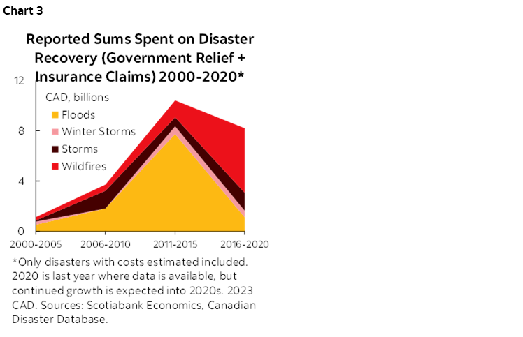 Disruptions are easily navigated when capital is flowing, which is likely the secret to Canada’s economic resilience. A silver lining perspective on data challenges is that a lack of clear, lasting impacts could be evidence that communities rebound rapidly following disasters, a testament to the efficacy of insurance markets and government programs. Broader literature does indicate this may be true, with upcoming Bank of Canada research indicating regions that qualify for federal disaster assistance funding may experience fewer enduring economic effects than those that do not, particularly in provinces with large debt levels whose fiscal firepower is limited. Over the long-run, theory also suggests reinvestment following negative shocks can improve regional output and employment, if new investments represent an improvement in productivity over what was previously there. These claims can be difficult to evaluate given the challenges outlined above, but capital outflows for disaster relief have certainly been increasing (chart 3). These figures do not even represent the full outlays of spending, as unincluded programs such as employment insurance and crop production insurance (both publicly offered) can be, and often are, drawn upon to finance rebuilding or supplement lost income.