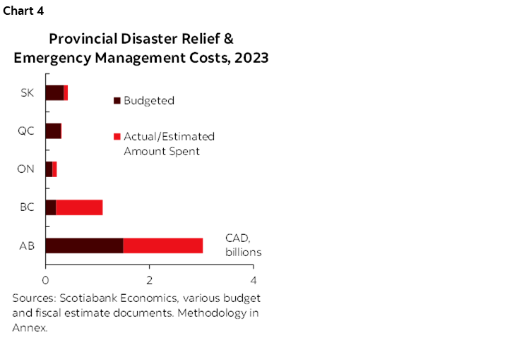 If insurance markets and public spending are the foundation upon which rebounds are built, Canadians (and governments) may be paying more than they think. An assessment of budget and fiscal estimates conducted for this report estimates that provincial expenses incurred for disaster relief and emergency management in 2023–2024 were roughly $5.4B (chart 4). This figure is 5.6x larger than currently available data indicates was spent by provinces on disaster relief over a full twenty-year period, despite the reality that our analysis is limited by available data (it does not include any foregone revenue implications or any capital expenditures to rebuild), and is therefore almost certainly an undercount. Importantly, our analysis indicated that disaster relief and management expenses were over 200% higher than what was originally budgeted, and every province exceeded original budget estimates. The cumulative impacts of all this spending can be substantial enough to affect public finances. Saskatchewan’s mid-year revision from a budget surplus to a deficit in 2023/24 due to unexpectedly high crop insurance payouts that were (partially) linked to drought conditions serves as just one example of the challenges disasters can pose to fiscal management.