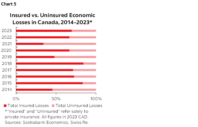 Households, the final payee in the climbing cost triple crown, are a question mark when it comes to scale of impacts. A rule of thumb known as “the insurance gap” indicates that for every $1 in insured losses, there are $3–$4 in uninsured losses borne by governments, businesses and individuals. Exact figures can be debated—SwissRe estimates 41% of damages incurred by natural disasters in Canada from 2014–2023 were not covered by insurance providers (chart 5)—but it is evident that uninsured damages are regularly incurred. Repairing these damages would presumably be financed through government spending occurring through the channels detailed above, or direct spending from households and businesses. Studies show changes in household debt are highest amongst those who are unable to receive public support through disaster relief channels, or when damages exceed the financial support received from public funding. It is likely expenses from homeowners are higher for those living in homes that are uninsurable due to flood risk, as is the case for the aforementioned 1.5M Canadian homes scattered throughout the provinces and territories.