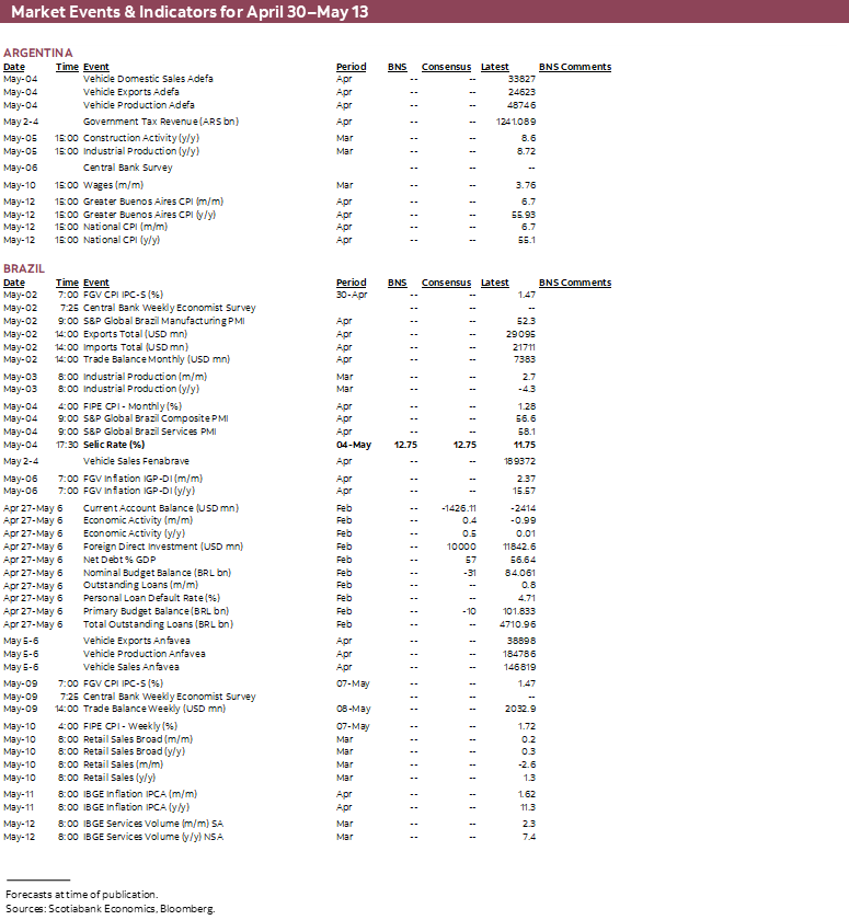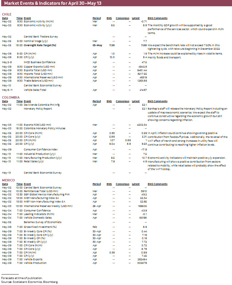 - A comprehensive risk calendar with selected highlights for the period April 30–May 13 across the Pacific Alliance countries, plus their regional neighbours Argentina and Brazil.