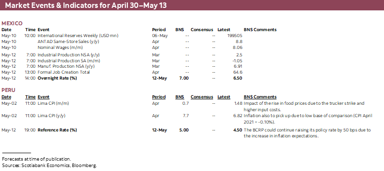 Furthermore, twelve-month inflation to March was 6.8%, and we expect it to rise to 7.6% in April, on its way to surpassing 8%, most probably, before stabilizing. This will affect inflation expectations further and put additional pressure on the BCRP to raise rates.