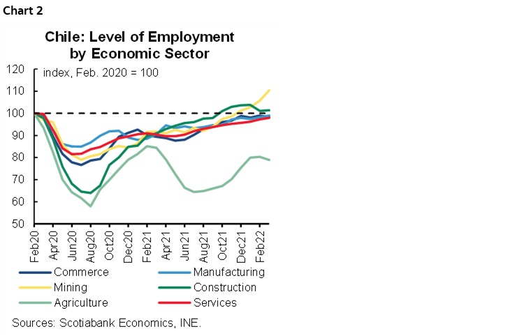 Meanwhile, on Thursday April 28, the statistical agency (INE) released the unemployment rate for the quarter ending in March, which rose to 7.8% again owing to higher labour force growth (0.7% m/m) as compared to that of employment (0.3% m/m). The increase in the unemployment rate in recent months is explained by the re-incorporation of men and women into the labour market at a rate that has outstripped job growth. Specifically, employment in services continues to grow (chart 2), which should support to economic activity going forward. In this sense, we do not think that there has been a deterioration in the labour market, since the low unemployment rate in the second half of last year reflected the obstacles to labour market participation posed by health restrictions as well as transfers and pension withdrawals.