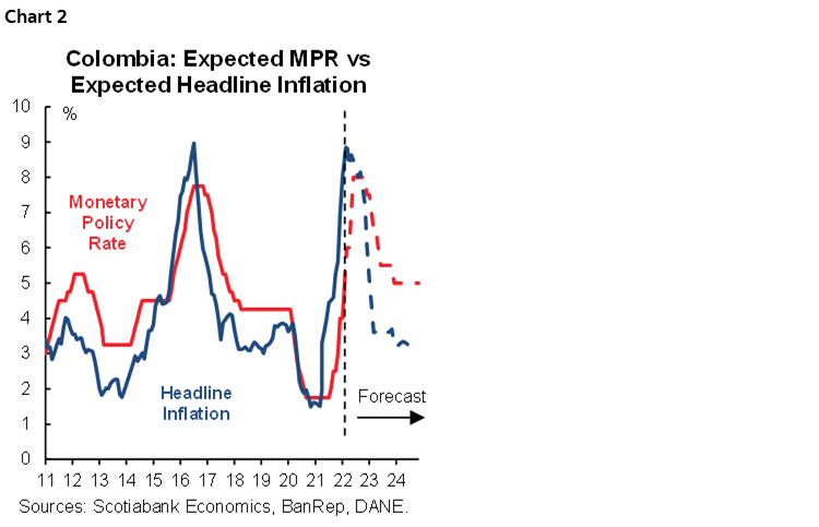 In this environment, with an encouraging economic growth outlook and upside risk on inflation, we expect the monetary policy rate to reach 8% (chart 2) by June—a level that would be contractionary, but which we expect to be temporary (prevailing for around six months). Although it remains to be seen how long current inflationary shocks will be sustained, prices would fall materially if these shocks dissipate and no additional shocks are experienced.