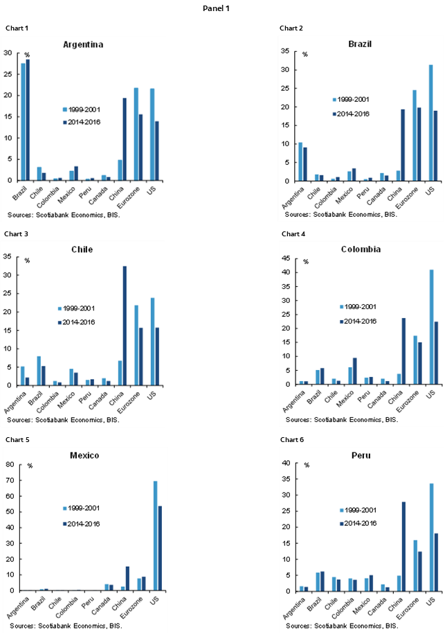 The second observation concerns intra-regional trade. It is a long-standing “stylized fact” that Latam countries trade more with countries outside the region than with their regional partners. This is illustrated by the various individual country trade weights (panel 1). The relative unimportance of intra-regional trade stands out. Moreover, with some exceptions, intra-regional trade weights have fallen over time.