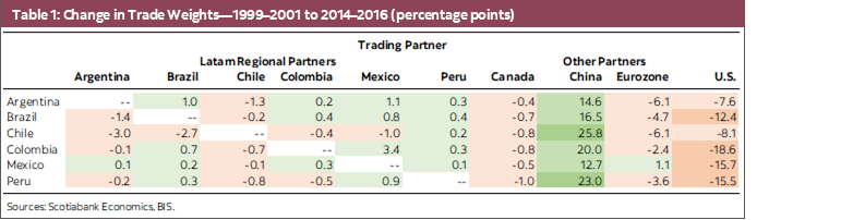 Breaking down the shifts in trade weights (table 1) yields two noteworthy observations. The first, clearly, is that China’s increased weight as a regional trade player has come at the expense of traditional partners, especially the US. Canada’s share in the region’s trade weights has likewise fallen, though these declines may have been limited by free trade agreements with the Pacific Alliance countries.
