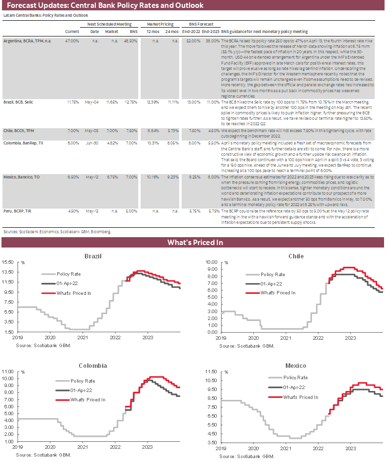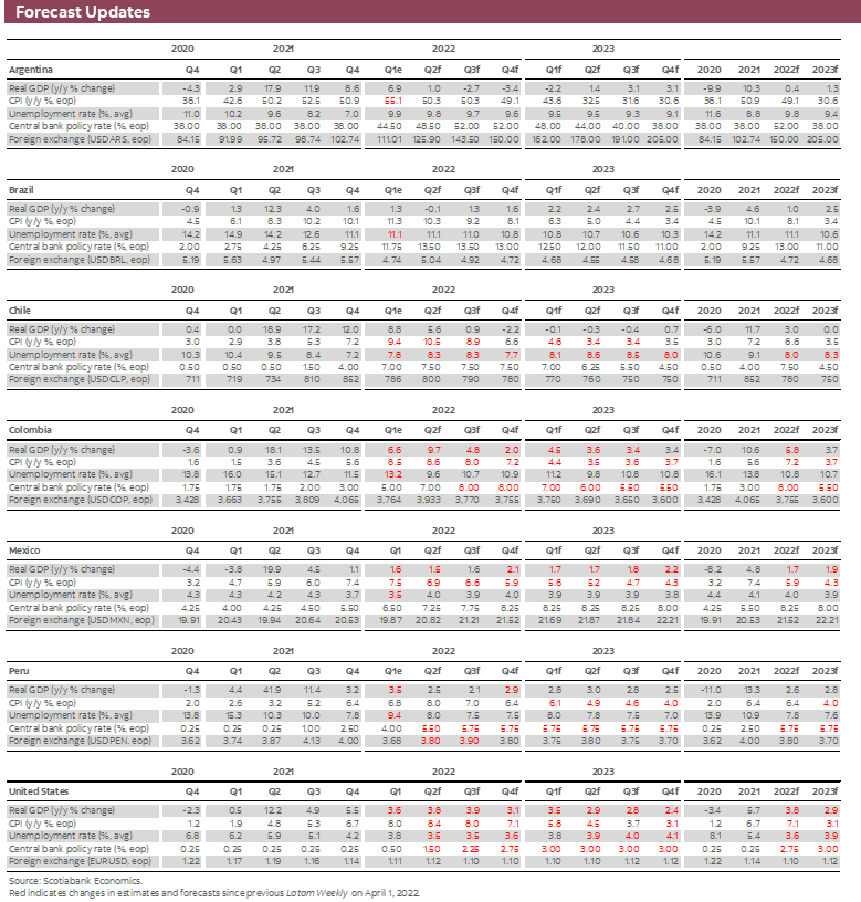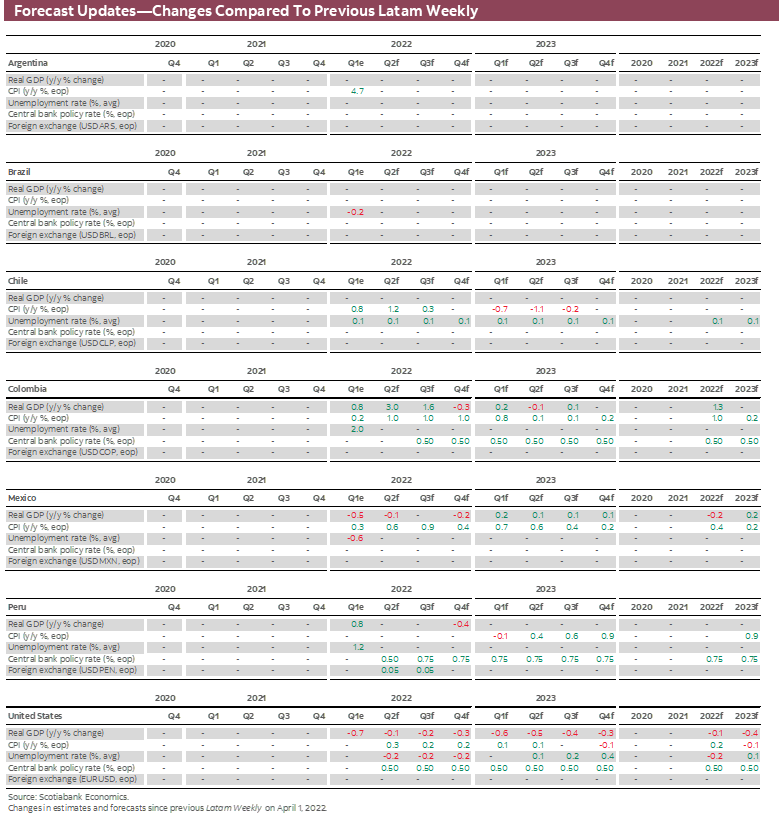 - Higher commodity prices resulting from Russia’s war on Ukraine have fueled global inflation and led to increased volatility in financial markets. With inflationary pressures threatening price stability commitments, Latam central banks have accelerated policy tightening with implications for growth. See the latest forecast revisions made by Scotiabank’s economists in the region in the table below.