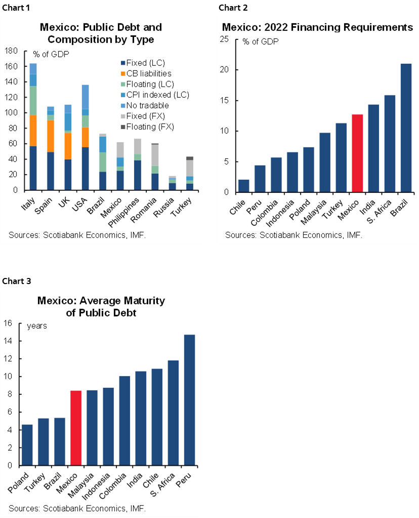 Despite these long-term challenges, Mexican debt is relatively well positioned to absorb the current global shock in which global inflation is driving domestic and foreign interest rates higher. Financing requirements for 2022 are around 13% of GDP (chart 1), which are manageable. The bulk of Mexico’s public debt is local currency-denominated carrying a fixed interest rate (chart 2), while the average maturity of public debt is relatively long (chart 3), at 8.4 years—meaning rates will reset over a longer period, giving the government time to adjust. Foreign currency debt represents 16% of GDP, of which roughly half is owed by state-owned enterprises, and with the bulk of Pemex’s revenues being USD-denominated, the government’s capacity to deal with potential FX volatility is relatively strong.