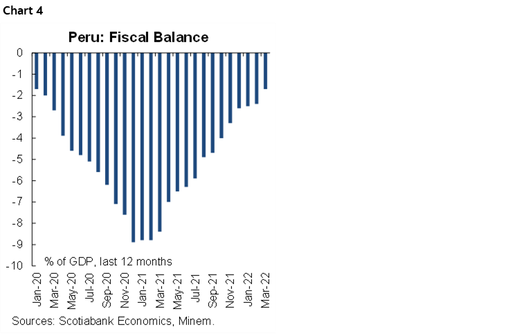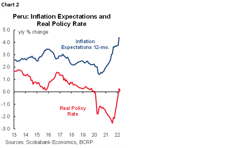 This recalibration does not reflect a change to our forecast of 2022 inflation of 6.4%. Rather, it incorporates the BCRP’s view of the current conjuncture, which puts considerable weight on inflation expectations. The BCRP has reported, for example, that inflation expectations rose sharply in March to 4.4%, up from 3.7% two months ago (chart 2). And in our view, expectations have not peaked. Meanwhile, in its recent policy statement, the BCRP eliminated references to inflation being “temporary” and extended the timeframe for inflation to return to the policy range (1% to 3%), to mid-2023. To us, this suggests increased concern over inflation at the BCRP.